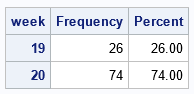 The table shows that 15MAY was in Week=19 for 26% of the years and was in Week=20 for 74% of the years. Thus, on average, 15MAY is located at Week=19.74, as shown by the following call to PROC MEANS.