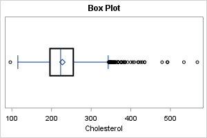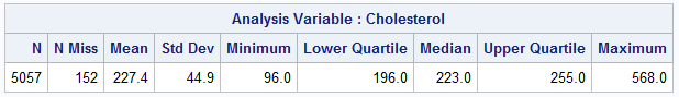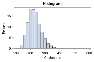 %let DSName = sashelp.heart; %let varName = Cholesterol; /* display descriptive statistics */ proc means ndec=1 data=&DSName N NMiss Mean Std Min Q1 Median Q3 Max; var &varName; run; |