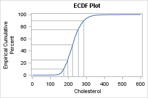 If I am creating the ECDF plot for myself or for a statistically sophisticated audience, I will use PROC UNIVARIATE directly. However, if I am creating the plot for a less sophisticated audience, I prefer to augment the ECDF with a set of "droplines" that show the values associated with the 10th, 25th, 50th, 75th, and 90th percentiles of the data. To do that, I use PROC UNIVARIATE to generate the plot, then use an ODS OUTPUT statement to write the data underlying the plot to a SAS data set. I can then use PROC SGPLOT to add the drop lines, as follows: