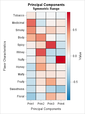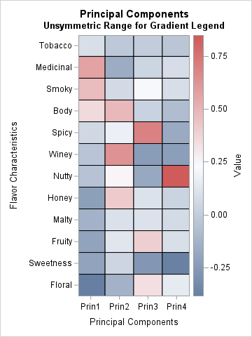 /* Use a heatmap to visualize the PCs. First, transform from wide format to long format. See https://blogs.sas.com/content/iml/2011/01/31/reshaping-data-from-wide-to-long-format.html */ proc transpose data=PCs out=LongPC(rename=(Col1=Value)) name=PC; by Variable notsorted; /* for each row */ var Prin1-Prin4; /* make a row for these variables */ run; title "Principal Components"; title2 "Unsymmetric Range for Gradient Legend"; ods graphics / width=360px height=480px; proc sgplot data=LongPC; heatmapparm x=PC y=Variable colorresponse=Value / colormodel=AltTwoColor outline; yaxis reverse; label PC="Principal Components" Variable="Flavor Characteristics"; run; |