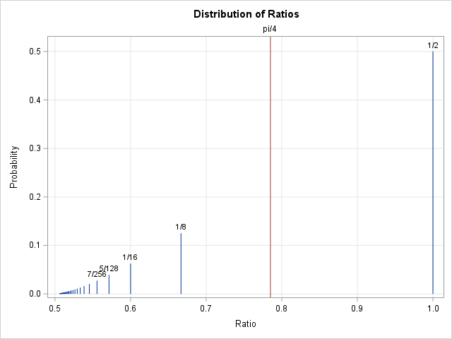 This is shown graphically in the plot to the right. (Click to enlarge.) Each vertical bar is located at a ratio that represents the number of heads divided by the number of coin tosses. The height of the bar is the probability that the ratio will occur in the coin-tossing game. The red vertical line is the quantity π/4. The mathematical result is that the π/4 is the weighted sum of all the ratios.