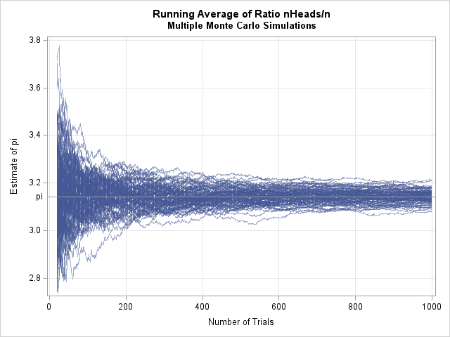 There are several Monte Carlo simulations that estimate pi, but now we have a new method: simulate many people tossing a coin until the number of heads is greater than the number of tails. You can write a simple DATA step in SAS to perform the Monte Carlo simulation, as follows: