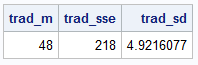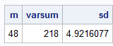 proc iml; y = {48, 51, 46, 37, 45, 50, 46, 51, 51, 55}; /* A traditional or "offline" calculation of the mean and standard deviation uses two passes through the data: One for the mean, and a second pass for the sum of squared deviations, which gives the variance or standard deviation. */ trad_m = mean(y); trad_sse = ssq(y - trad_m); trad_sd = std(y); print trad_m trad_sse trad_sd; /* sample mean = 48; StdDev ~ 5 */ |