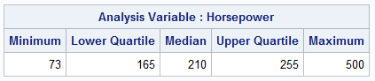 The code creates a DATA step view that adds a dummy variable (_Fake) to the data set. You can use PROC MEANS to obtain the five-number summary of the data: