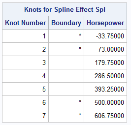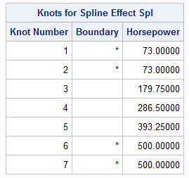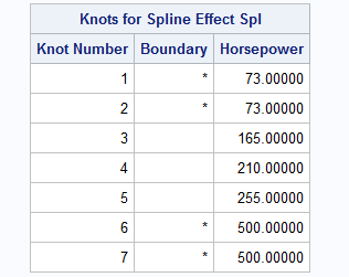 The ODS SELECT statement selects two output tables, which are shown above. The SplineKnots table provides information about the placement of knots. For the PERCENTILES(3) method, there are d knots placed at the minimum value of the X variable, 3 interior knots placed at the 25th, 50th, and 75th percentiles of the X variable, and d knots placed at the maximum value of the X variable. The exterior or boundary knots are indicated by an asterisk. Notice that it is mathematically acceptable to stack two or more knots at the same position.
