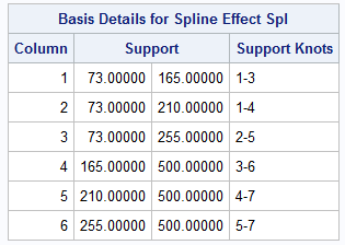 The BSplineDetails was created by using the DETAILS option on the EFFECT statement. It tells you that the basis consists of 6 spline functions. The first basis function has support (that is, nonzero values) on the interval defined by the first three knots, which is [min(X), 25_th_Pctl]. The second basis function has support on the interval defined by the knots 1-4, which is [min(X), 50_th_Pctl]. This information continues until the sixth basis function, which has support on the interval defined by the knots 5-7, which is [75_th_Pctl, max(X)].