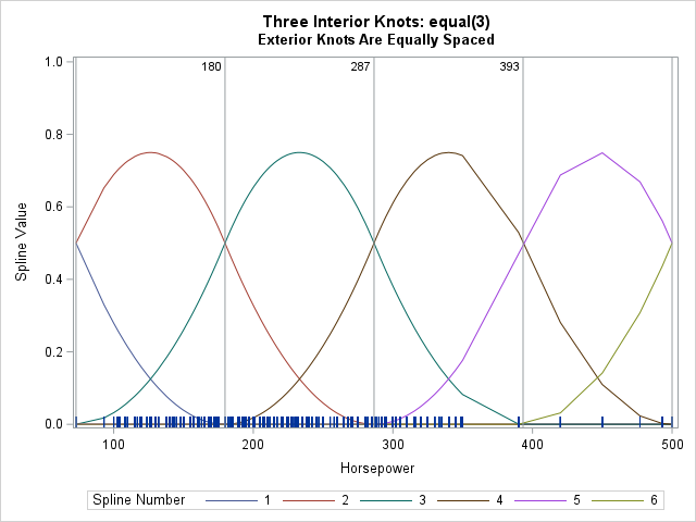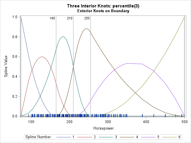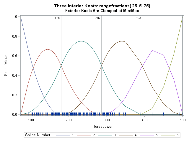 The output confirms that the interior knots are placed the same as for the EQUAL(3) option, but the exterior knots are clamped at the extreme values of the data. The following statement visualize the spline basis: