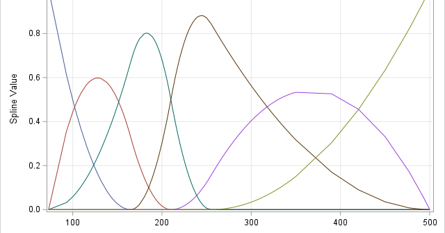 A previous article discusses regression splines and how to use the EFFECT statement in SAS regression procedures to specify the location of knots for a regressor variable, X. Knots are breakpoints that partition the range of X into subintervals. The splines are defined on a set of adjacent subintervals. The