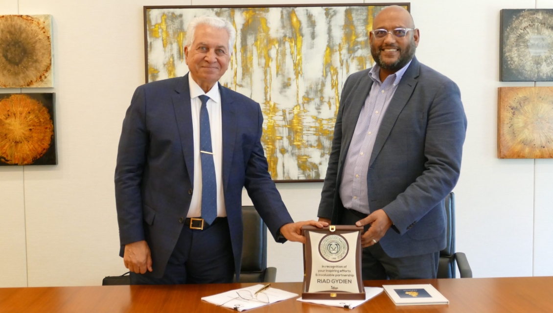 - Mostafa Hodieb (left) presents a recognition plaque to Riad Gydien on behalf of AAMBFS, which reads: “In recognition of your inspiring efforts and invaluable partnership.”