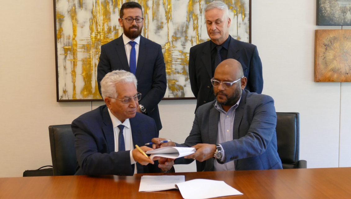- Mostafa Hodieb and Riad Gydien exchange agreements as Ahmed Kamal and Murray deVilliers look on.