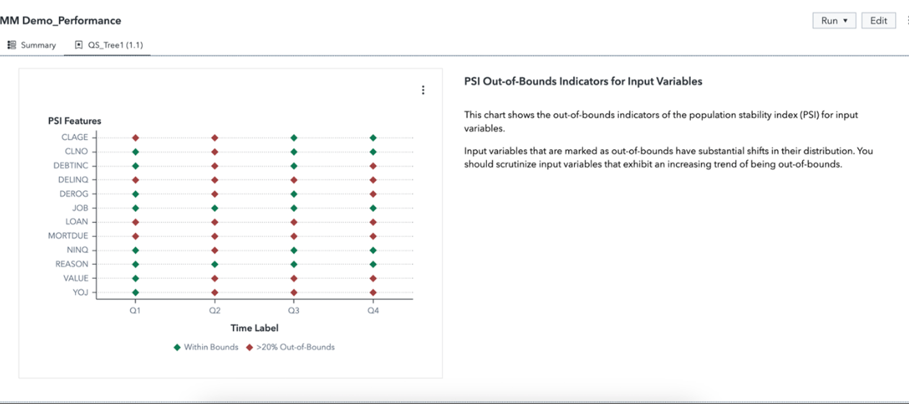 - Fig. 3: Performance monitoring in SAS Model Manager lets users check PSI out-of-bounds indicators for input variables over time that help scrutinize input variables that show increasing tendency of being out of bounds.