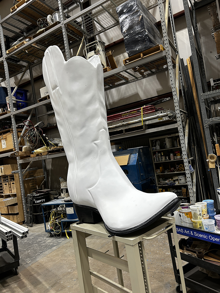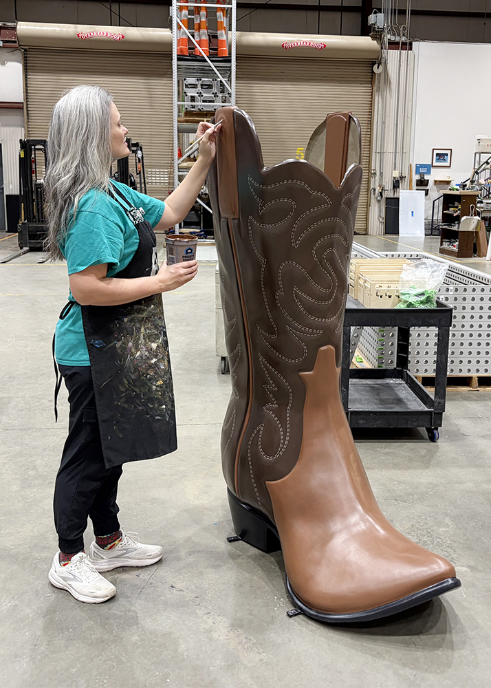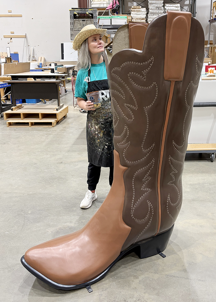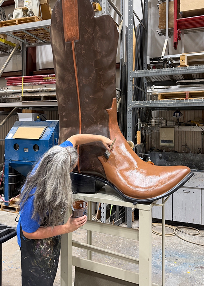 The pieces are made of fiberglass and were delivered primed and ready for paint. The scale alone changes how the work happens. The boot stands six feet tall and the hat was mounted on a metal arm that allowed it to be raised and lowered during painting.