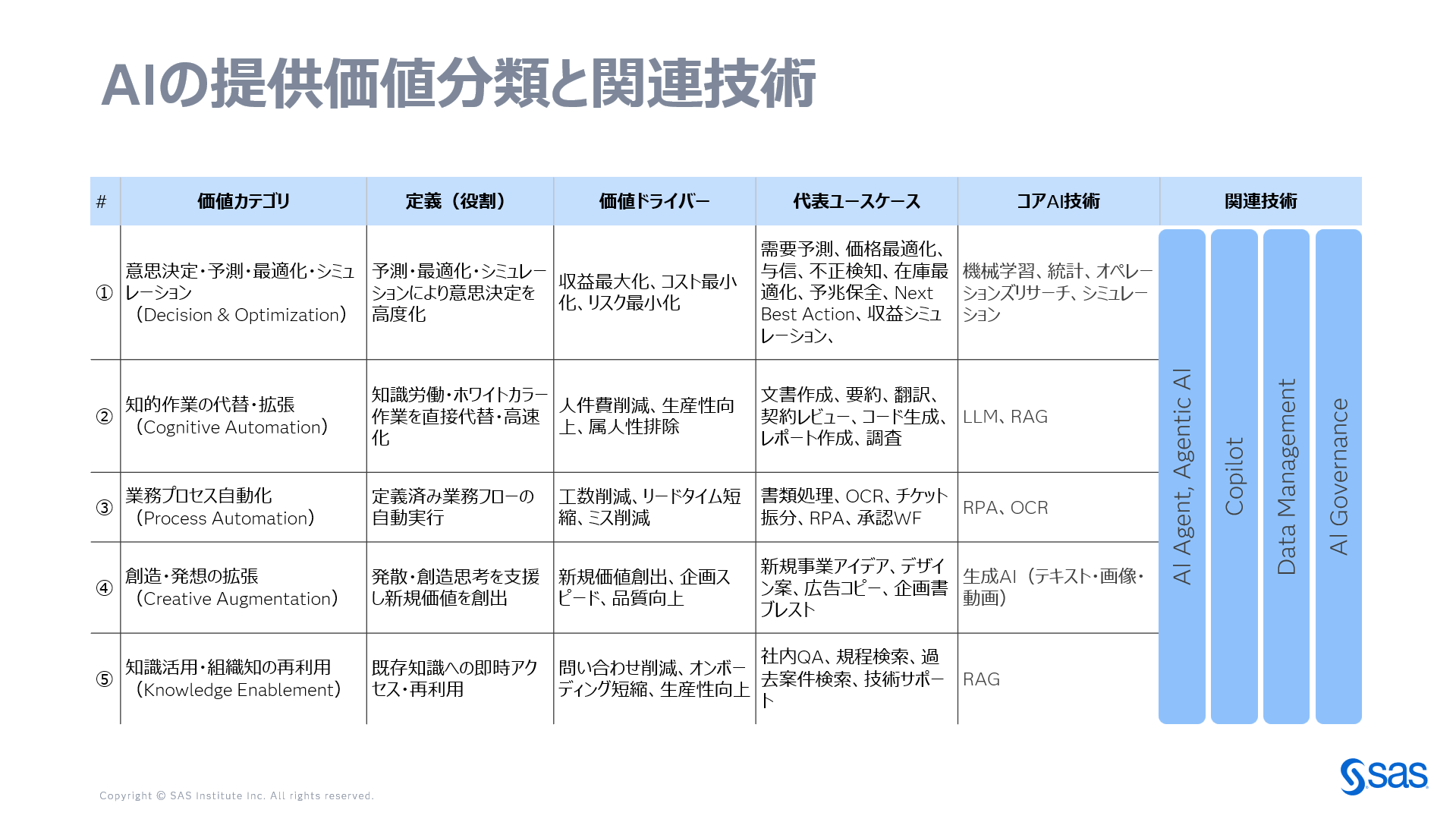 ここで注意したいのは、AI Agent/Agentic AI、Copilot、Data Management、AI Governanceといった技術要素は、特定の提供価値のみに紐づくものではないという点です。