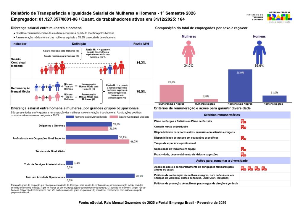 Reforçando nosso compromisso com a transparência e esforços de melhoria contínua, e em cumprimento à Lei nº 14.611, divulgamos abaixo o último relatório de transparência salarial, referente ao 1º semestre de 2026: