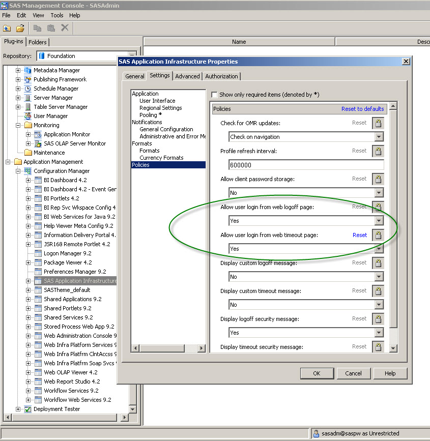 All the administrator needs to do, from SAS Management Console, is to expand the 'SAS Application Infrastructure' properties, jump to the 'Settings' tab, and within 'Policies' change the default 'No' to 'Yes' for the options: