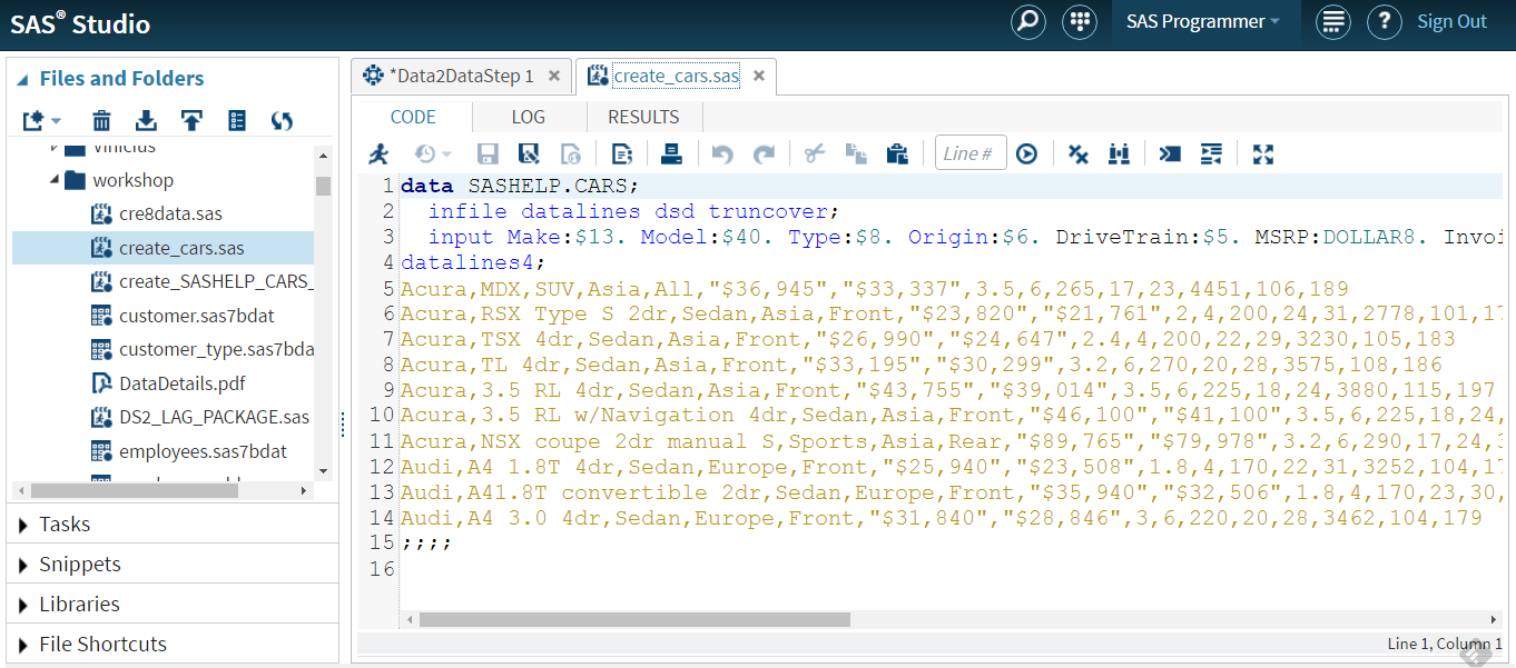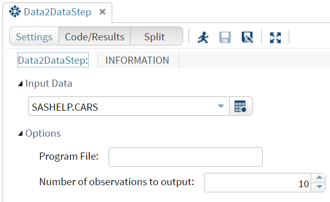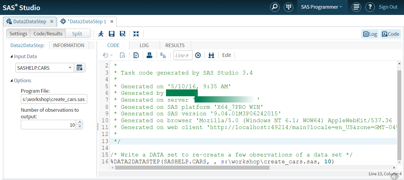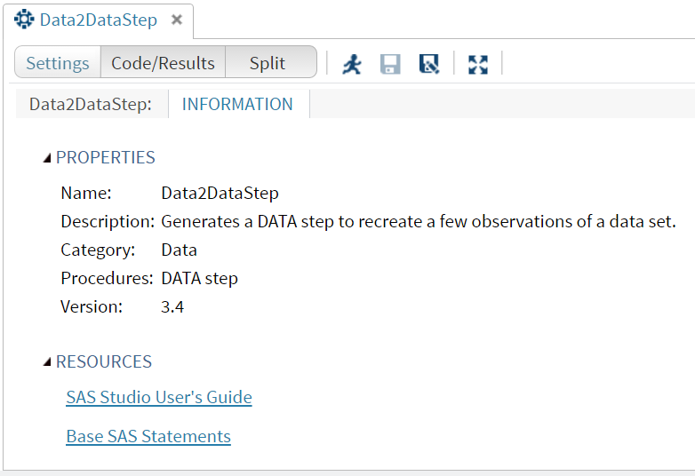 Save the task, and that’s it! Now we are ready to test our task. In the SAS Studio Tasks riser bar, choose the new task (My Tasks -> Data ->Data2Datastep). Fill in the form, and watch the code dynamically build in the Code/Results tab!