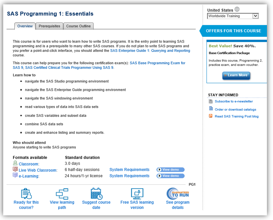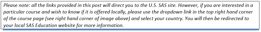 In my last post How Can I Learn SAS?, I discussed the various training formats SAS offers. Usually individuals do not decide the method of training format first – their initial search is to find a course to attend. If you have looked at the complete course list, it can be an overwhelming starting point. Below I have listed some of the most popular SAS courses and some pointers to help guide you. This is by no means an exhaustive list. For every SAS course offered on the SAS Education website, there is a detailed breakdown, including: