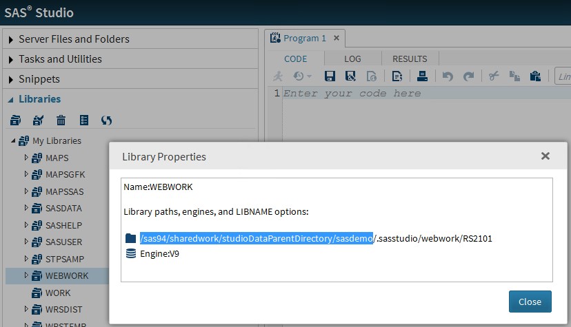 You – or your SAS Administrator – changed the value of the webdms.studioDataParentDirectory option. How can you know if the change has been correctly applied? This is the same as asking, how can I know where this option is currently pointing to? Here is a quick tip. This property influences the location of the WEBWORK directory. Simply open the Libraries pane, right click on WEBWORK to select “Properties”, and here you are. The highlighted path in the following screenshot shows the current value of the option: