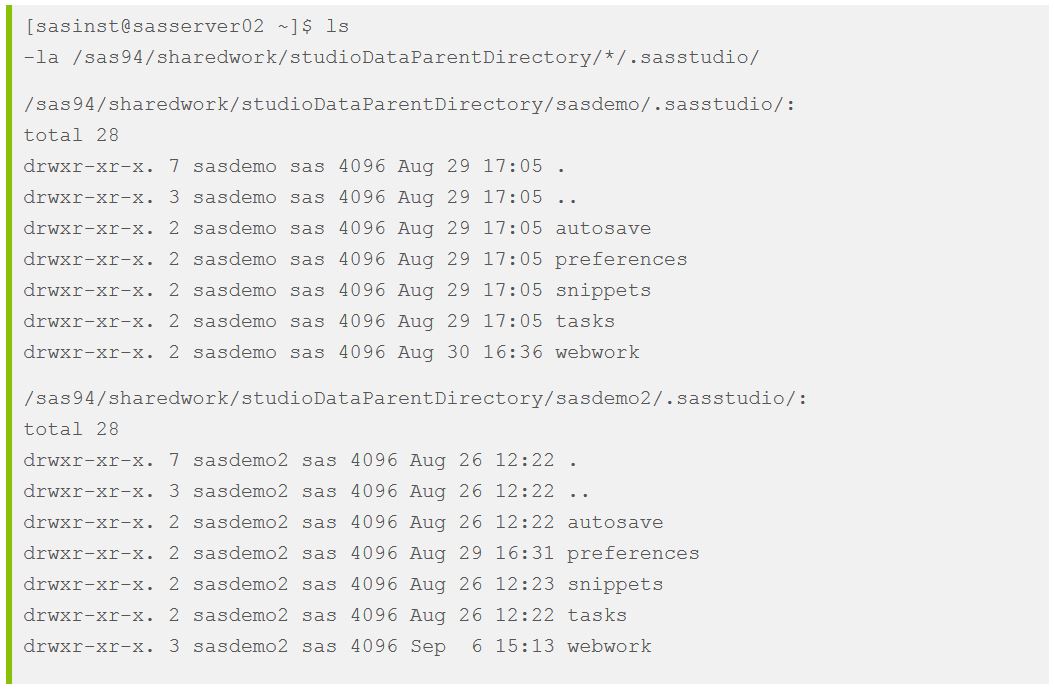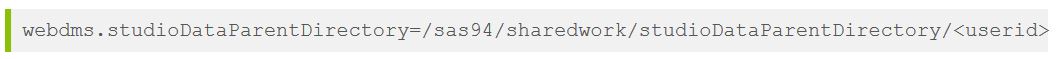 Until SAS Studio 3.4, the only solution to this uncertainty was to have end users’ home directories shared across all the grid nodes. SAS Studio 3.5 removes this requirement by providing administrators with a new configuration option: webdms.studioDataParentDirectory. This option specifies the location of SAS Studio preferences, snippets, my tasks, and more. The default value is blank, which means that the behavior is the same as in previous releases. An administrator can point it to any shared location to access all of this common data from any workspace server session.