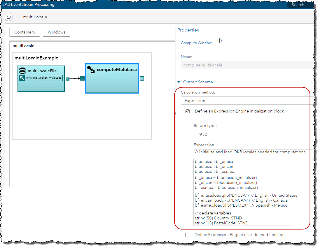 In an ESP Compute window, I first need to initialize the call to the Expression Engine Language function and load the three QKB locales needed – ENUSA (English – United States), ENCAN (English – Canada), and ESMEX (Spanish – Mexico).