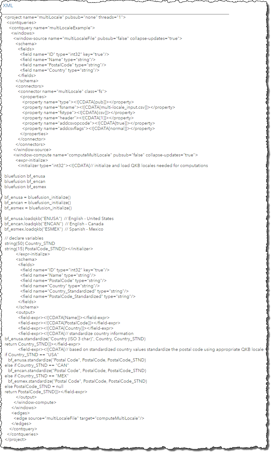 To illustrate how to do this I will review an example where I have event stream data that contains North American postal codes. I need to standardize the values appropriately depending on where they are from – United States, Canada, or Mexico – using the Postal Code Standardization definition from the appropriate QKB locale. Note: This example assumes that the QKB for Contact Information has been installed and the license file that the DFESP_QKB_LIC environment variable points to contains a valid license for these locales.