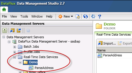 Here an example to get the REST API information for the Data Management job “ParseAddress.ddf” which is in the subdirectory Demo of Real-Time Data Services on DM Server: