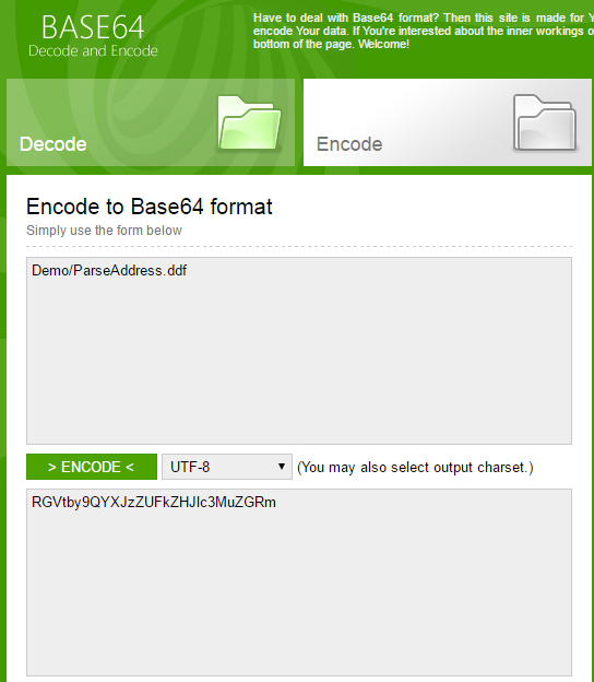 We Base64 encode the job name “Demo/ParseAddress.ddf” using the website mentioned above…