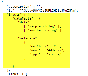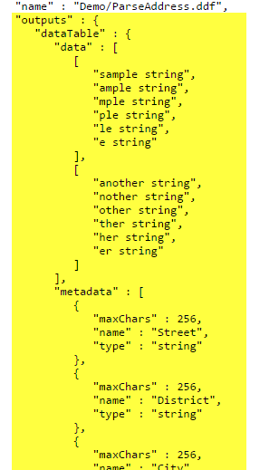 {"inputs" : {"dataTable" : {"data" : [[ "sample string" ],[ "another string" ]], "metadata" : [{"maxChars" : 255, "name" : "Address", "type" : "string"}]}}}