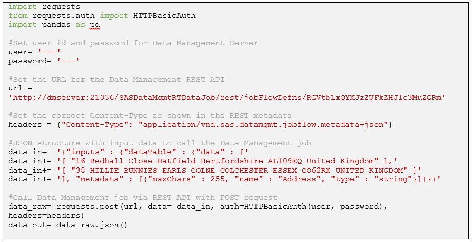 With DataFlux Data Management 2.7, the major component of SAS Data Quality and other SAS Data Management solutions, every job has a REST API automatically created once moved to the Data Management Server. This is a great feature and enables us to easily call Data Management jobs from programming languages like Python. We can then involve the Quality Knowledge Base (QKB), a pre-built set of data quality rules, and do other Data Quality work that is impossible or challenging to do when using only Python.