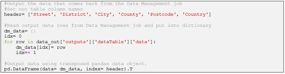 The output data from the Data Management job will be in data_raw. We call the built-in JSON decoder from the “request” module to move the output into a dictionary (data_out) from where we can access the data. The structure of the dictionary is according to the REST metadata. We can access the relevant output data via data_out[‘outputs’][‘dataTable’][‘data’]