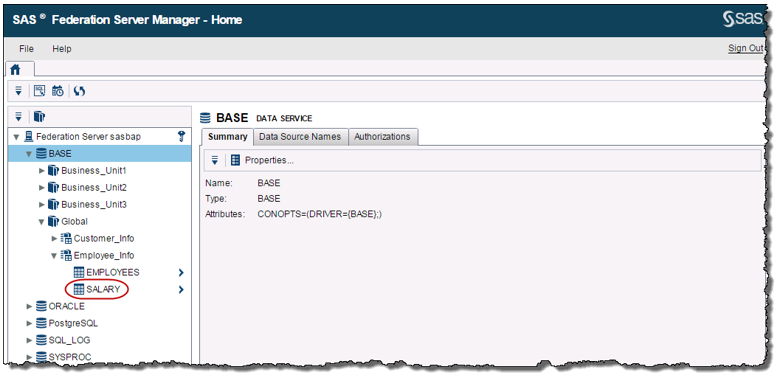 The SAS Federation Server Administrator has setup the BASE catalog and schema information in Federation Server Manager. The SALARY table is located in the Employee_Info schema within the Global catalog.