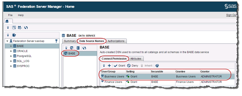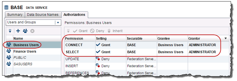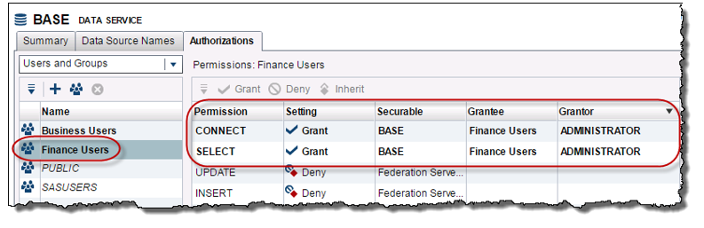 The SAS Federation Server Administrator has also explicitly granted the CONNECT and SELECT permissions to both the Business Users and Finance Users group for the BASE Data Service.