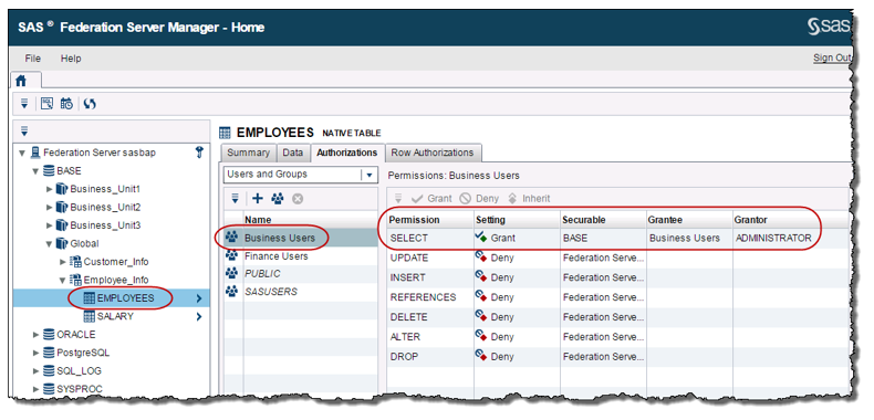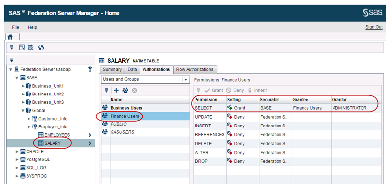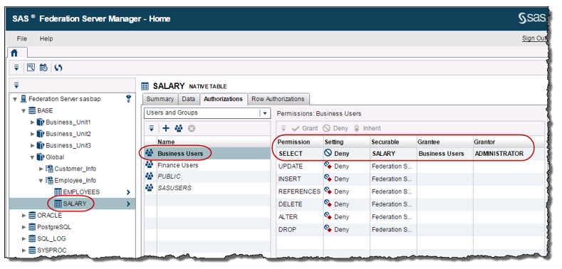 For the SALARY table, the SAS Federation Server Administrator has explicitly denied the SELECT permission for the Business Users group whereas the Finance Users groups has inherited the Grant setting for the SELECT permission on the SALARY table.
