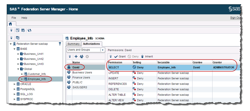 If I want to prevent David from accessing any of the tables or views in the Employee_Info schema, but still allow other Business Users to access them, then as the SAS Federation Server Administrator I can explicitly deny the user, David, the SELECT permission for the Employee_Info schema as shown below.