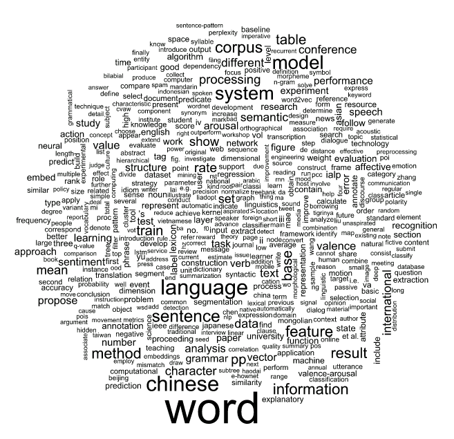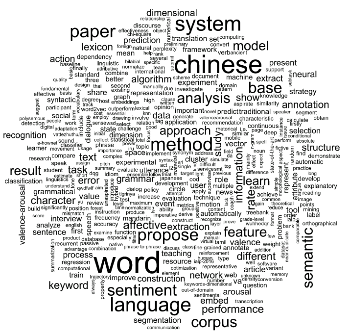 From figure-1, it is easy to see that the top 10 words were: word, language, chinese, model, system, sentence, corpus, information, feature and method. IALP is an international conference, and does not focus on Chinese only. However there was a shared task at this year’s conference, and its purpose is to predict traditional Chinese affective words’ valance and arousal ratings. Moreover, each team who had attended the shared task was requested to submit a paper to introduce their work, so “Chinese” contributed more than other languages in the word cloud.