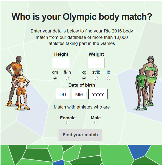The data for this interactive was from the Olympic Data Feed, which is used by the BBC and other broadcasters to show the results of all the different events. As part of this feed, the height, weight and age of over 10,000 athletes was available for my team to repurpose.