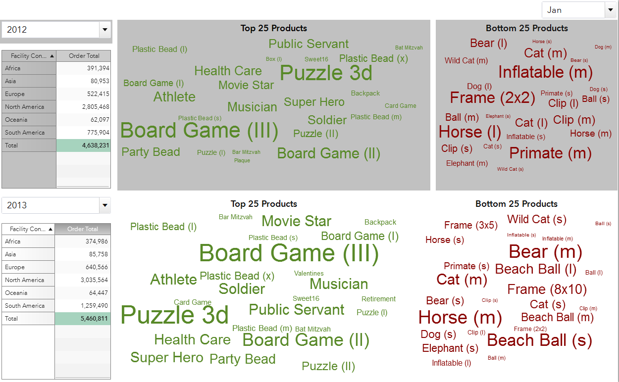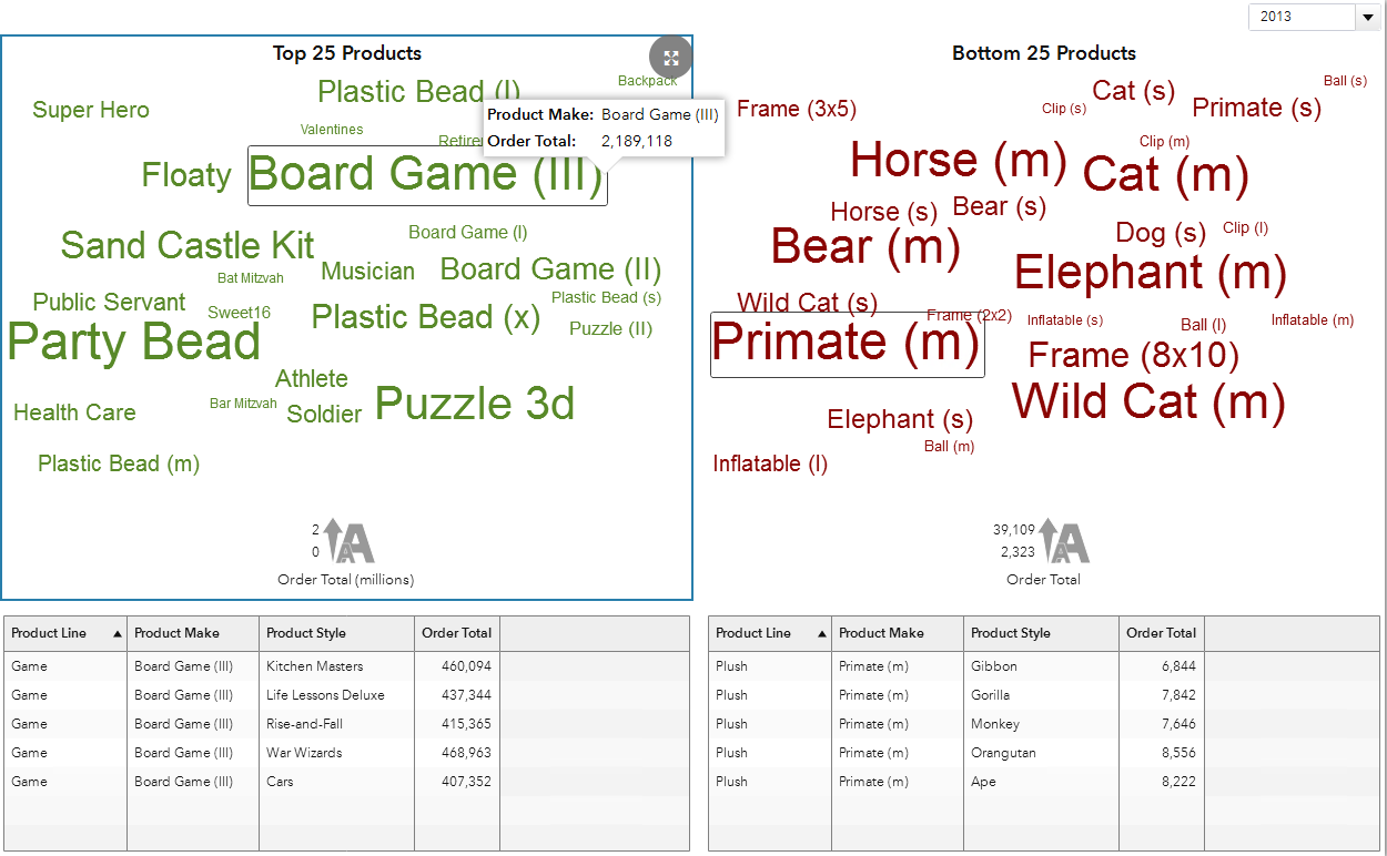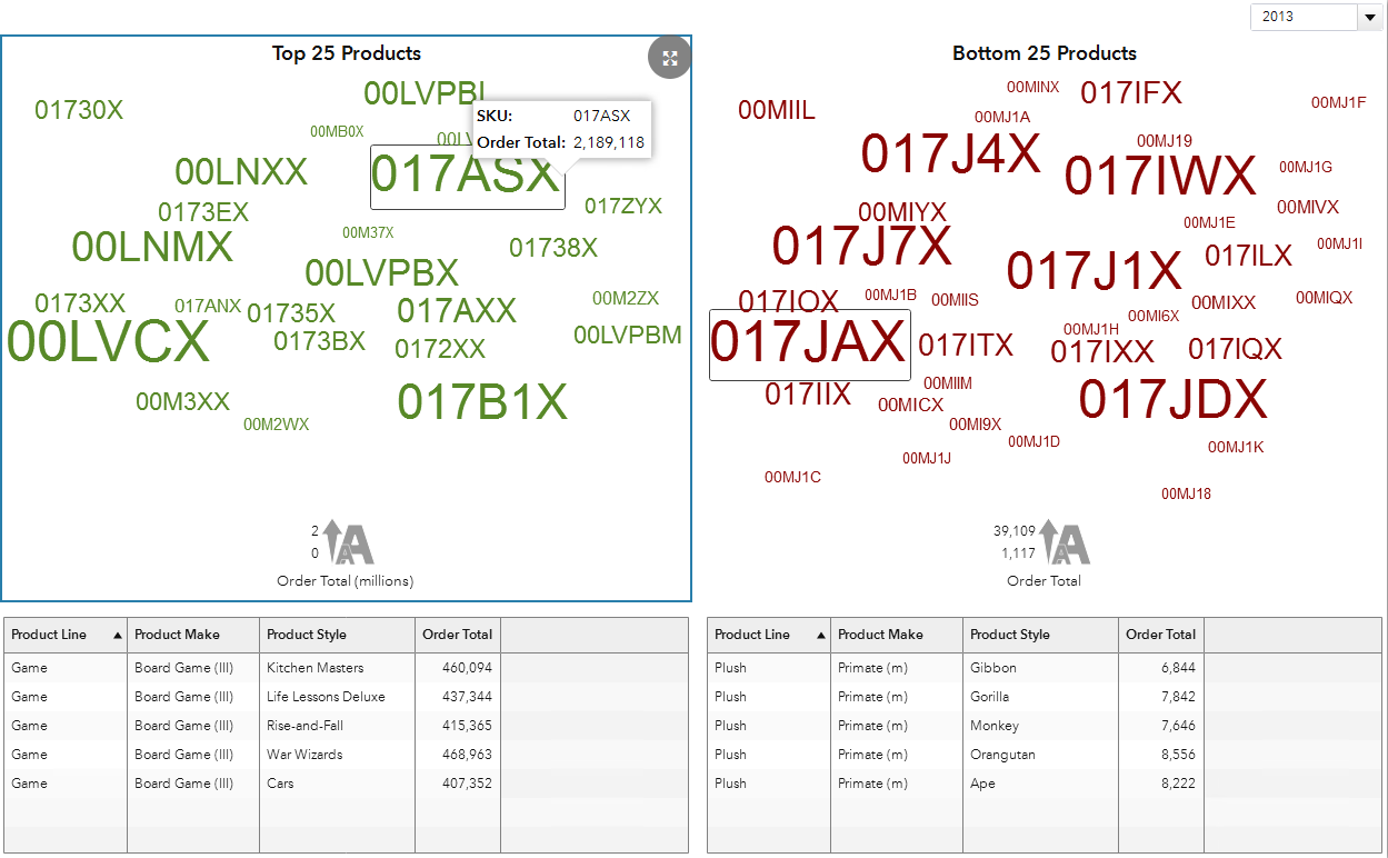 As the word cloud in SAS Visual Analytics 7.3 Designer has a maximum row return of 100, I have used the Rank feature to look at the top 25 Products and the bottom 25 Products. I also created a filtered interaction between the word clouds and their respective list tables below to show a bit more detail around the next level in the hierarchy after Product Make.