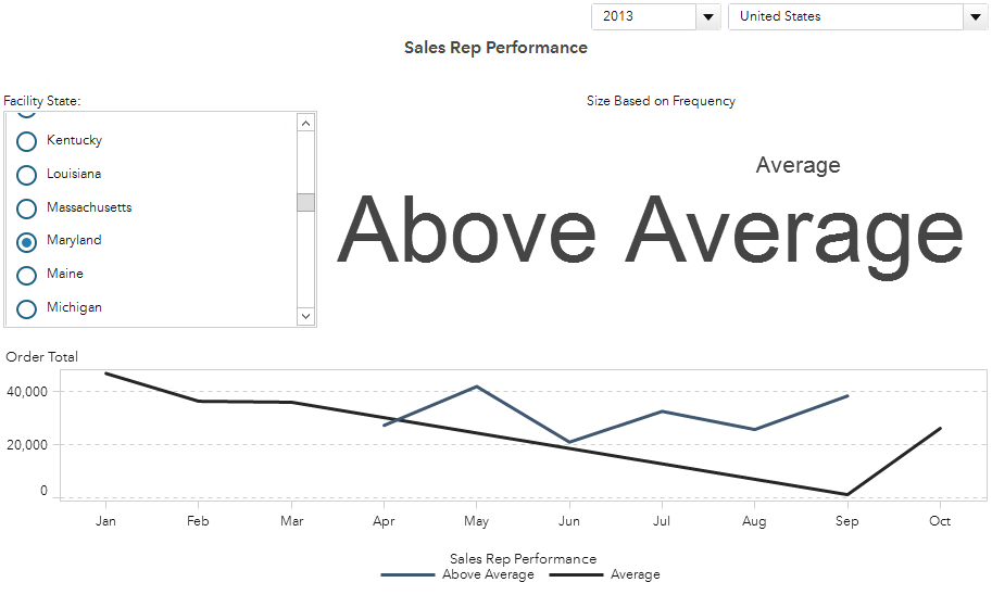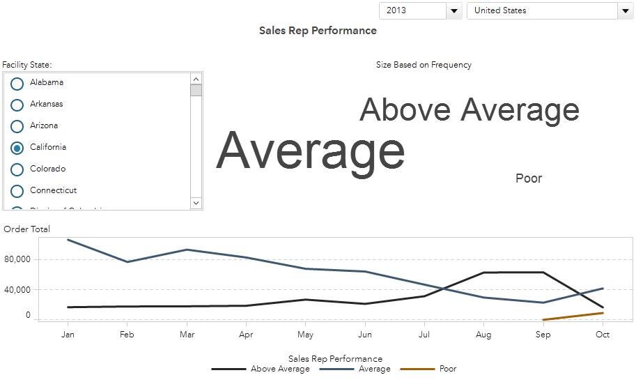 Using a word cloud for this new category data item allows you to quickly move through the different states and compare the Sales Rep Performance frequency. You could also use this new category to compare each performance group’s Order Totals.