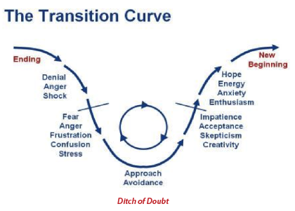 Of course there were and still are some issues. As the Transition Curve shows, not everyone is going to follow you and embrace the change you bring. Team members who have been expert in their fields and are happy doing what they do suddenly find they have to learn new things and can feel de-skilled. By definition, they cannot be an immediate expert at something new that they are asked to do and that can be difficult.