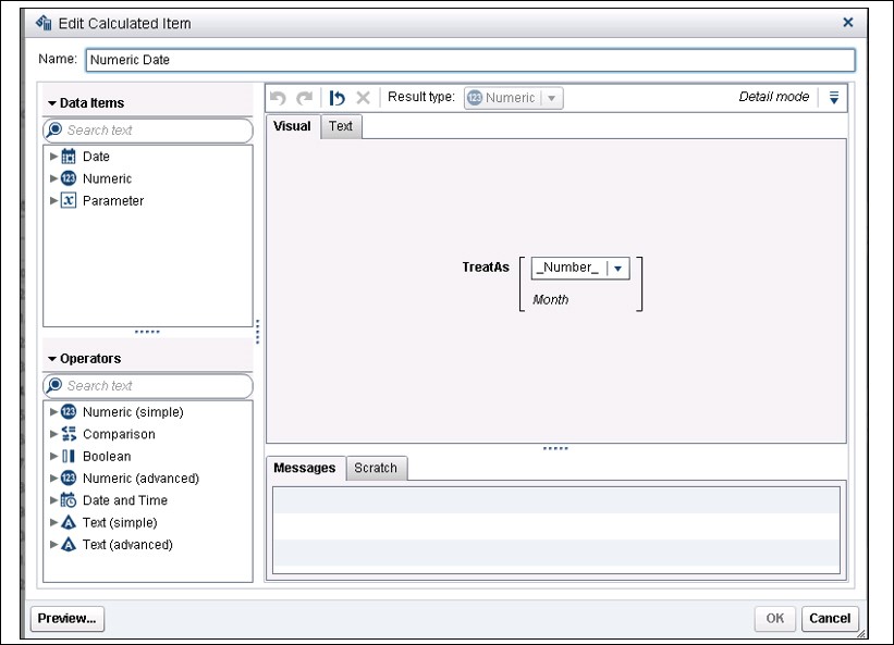 Since we want to display the last n months, we create a new calculated data item, Numeric Date, calculated as below, using the TREATAS operator on the Month data item: