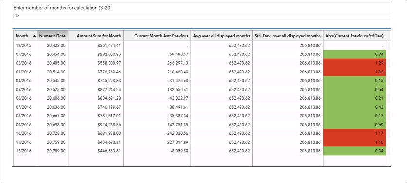 The example report shown below allows the user to type in a number, n, between 3 and 20, to display a report consisting of the amount values for past n months, the amount values for Current Month Amt-Previous, the Avg over the last n months, the Standard Deviation over the last n months, and the absolute value of the (Current Month Amt – Previous Month Amt), divided by the Standard Deviation over the last n months. A Display rule is applied to the final Abs column, showing Green for a value less than 1 and red for a value greater than or equal to 1.