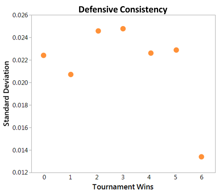Teams that win more games in the tournament defend the 3 point shot only slightly better than the other teams, but they are twice as consistent in doing it! So, regardless of who’s coming to play, look for some sticky D beyond the arc!