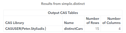 proc cas; simple.distinct / table={name="cars", caslib="casuser"}, casOut={name="distinctCars", caslib="casuser"}; quit; |