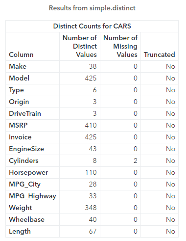 proc cas; simple.distinct / table={name="cars", caslib="casuser"}; quit; |