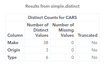 To begin, let's use the simple.distinct CAS action on the CARS in-memory table to view the action's default behavior.
