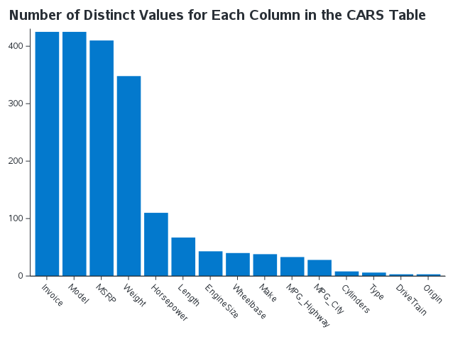 title justify=left height=14pt "Number of Distinct Values for Each Column in the CARS Table"; proc sgplot data=casuser.distinctCars noborder nowall; vbar Column / response=NDistinct categoryorder=respdesc nooutline fillattrs=(color=cx0379cd); yaxis display=(NOLABEL); xaxis display=(NOLABEL); quit; |