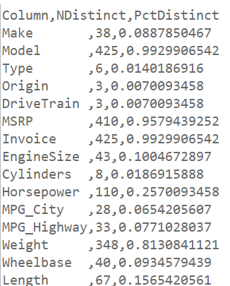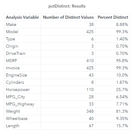 Now that we have the number of distinct values in each column, and the total number of rows in the CARS CAS table, we can calculate the total percent of distinct values in each column.