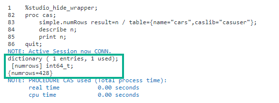 proc cas; simple.numRows result=n / table={name="cars",caslib="casuser"}; describe n; print n; ... |