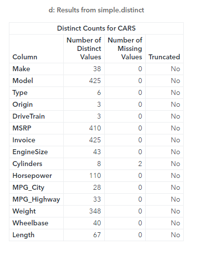 The distinct action is a flexible and easy way to explore your data. It allows you to quickly explore your distributed CAS tables, then process and save the results in a variety of formats to fit your needs.