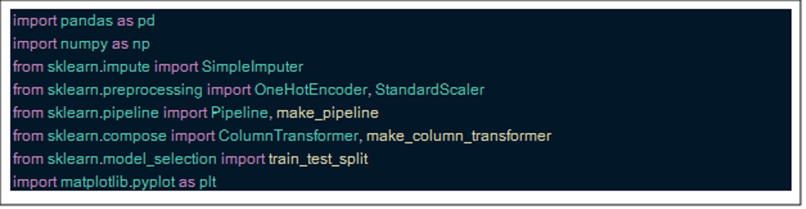 In this case, I imputed missing numerical data with the mean and applied a standard scaler. For categorical data, I imputed using the most frequent answer and finally conducted one hot encoding. As you can see, each preprocessing feature has its own pipeline which is useful, as the column transformer can run these in parallel to speed up preprocessing.